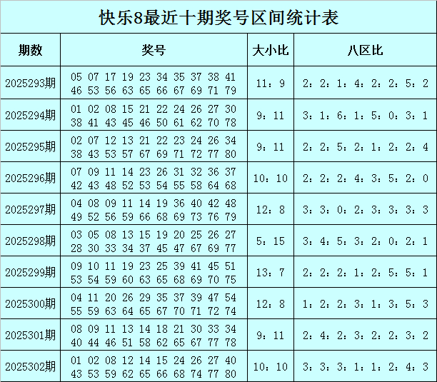 福彩快乐8第2025302期奖号为:01 02 08 12 14 15 24 26 27 40 43 53 59 62 65 66 68 74 77 80,其中奖号大小比为10:10,八区比为3:3:3:1:1:2:4:3。