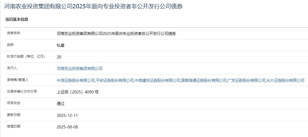 【大河财立方消息】12月11日,上交所债券项目信息平台显示,河南农业投资集团有限公司2025年面向专业投资者非公开发行公司债券项目获通过。债券拟发行金额20亿元,承销商/管理人为中信证券、平安证券、中信建投、国泰海通、广发证券、光大证券。